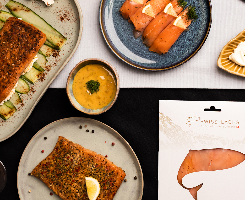 1x Smoked salmon, 500g; 1x Graved salmon with dill, 200g; 1x Hot smoked spicy salmon, 200g; 1x Hot smoked salmon with lemon and pepper, 200g; 1x Dill-Mustard sauce, 100g; 1x Horseradish cream, 100g