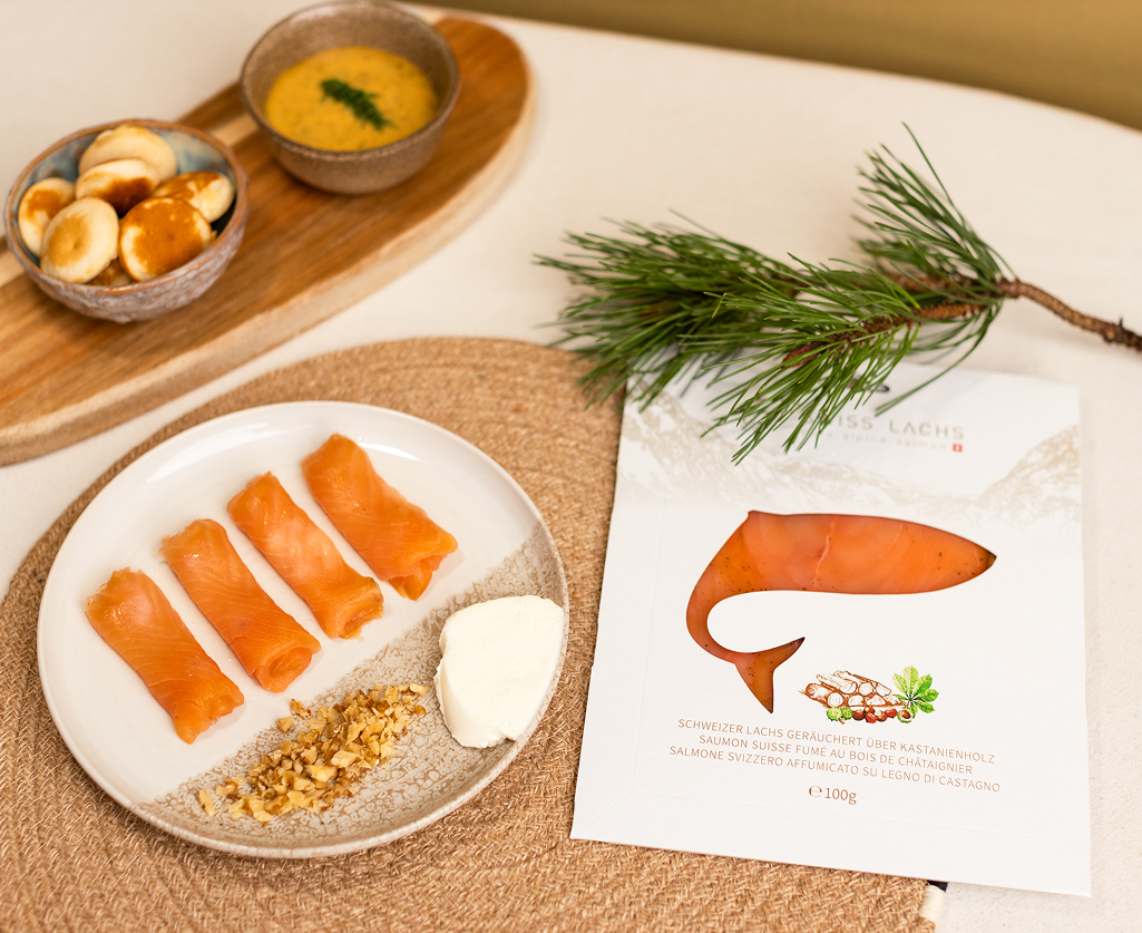 Cold-smoked Swiss salmon (Salmo salar), salt