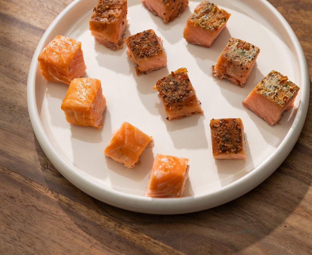Hot-smoked Swiss salmon (Salmo salar), salt