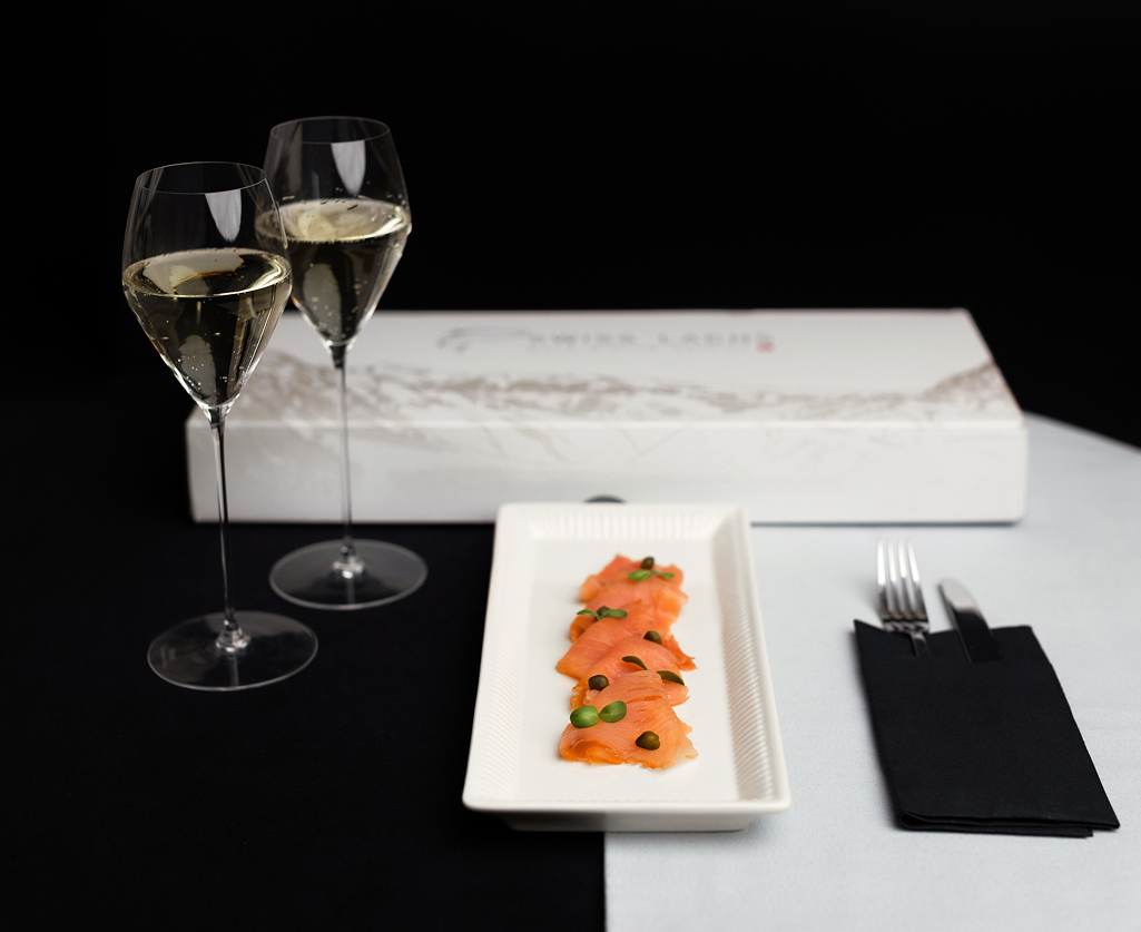 Cold-smoked Swiss salmon (Salmo salar), salt. Guerdon premium champagne “Enfant Terrible”, 750ml.