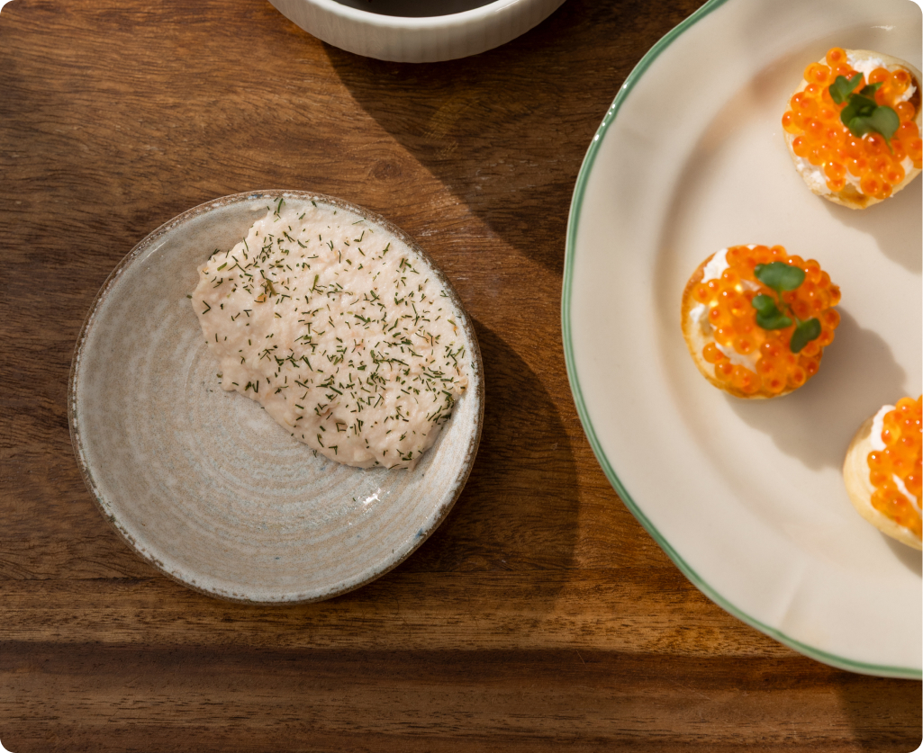 Smoked salmon 50%, water, QimiQ Whip (half cream, edible gelatine, emulsifier E472a, milk protein), white wine, lemon juice, chicken stock BIO (sea salt, glucose syrup, cane sugar, chicken powder, chicken fat, natural flavouring, onions, chicken stock, turmeric, caramelised sugar, citric acid, rosemary), salt, sea salt, ground white pepper